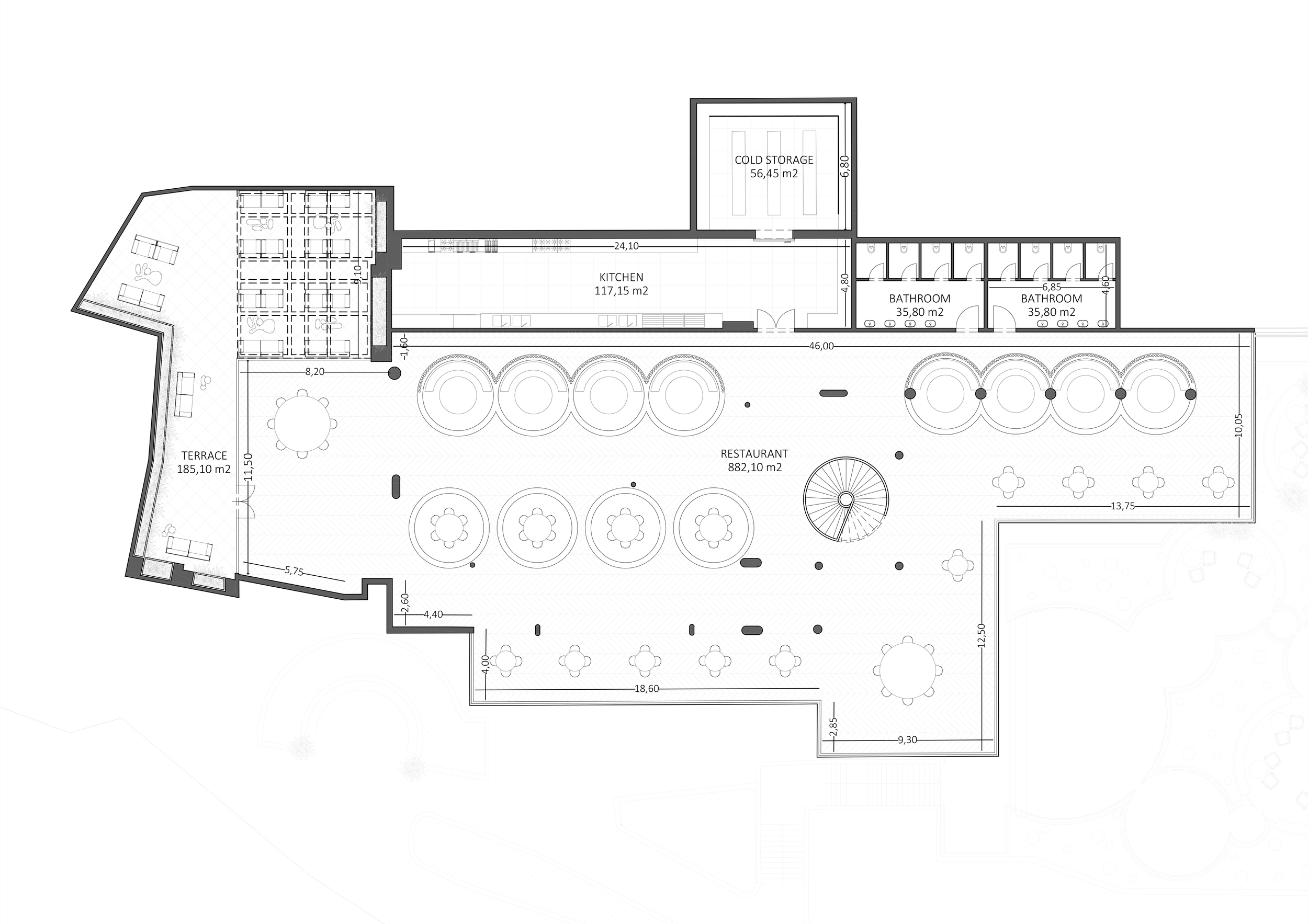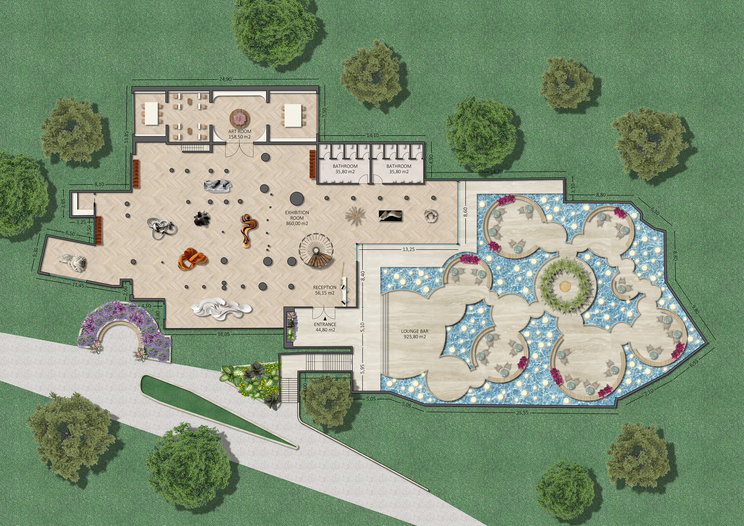 On the upper floor, the project features a refined restaurant with an outdoor terrace where guests can enjoy dishes inspired by Tuscan tradition, reimagined with a contemporary twist. Outside, a lounge bar unfolds among reflective water features and lush greenery, creating an intimate and relaxing atmosphere, perfect for any time of the day.